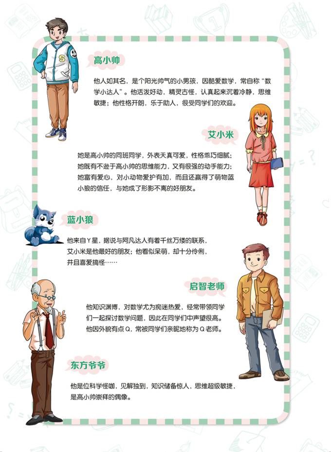 精心设计高小帅、艾小米、Q老师、东方爷爷和蓝小狼五大卡通形象,以他们为主角,编写与知识点相关的趣味漫画故事与例题,中间穿插丰富多元的百科知识,让抽象枯燥的数学知识变得生动形象、富有乐趣,全面激发学生的学习兴趣。